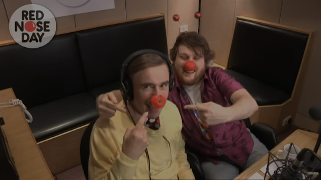 [ALAN and SIMON are in the Mid Morning Matters studio, both wearing Comic Relief red noses. However while SIMON's is the up-to-date 2011 'Honkus' iteration, Alan is wearing the 1993 'Tomato' nose]